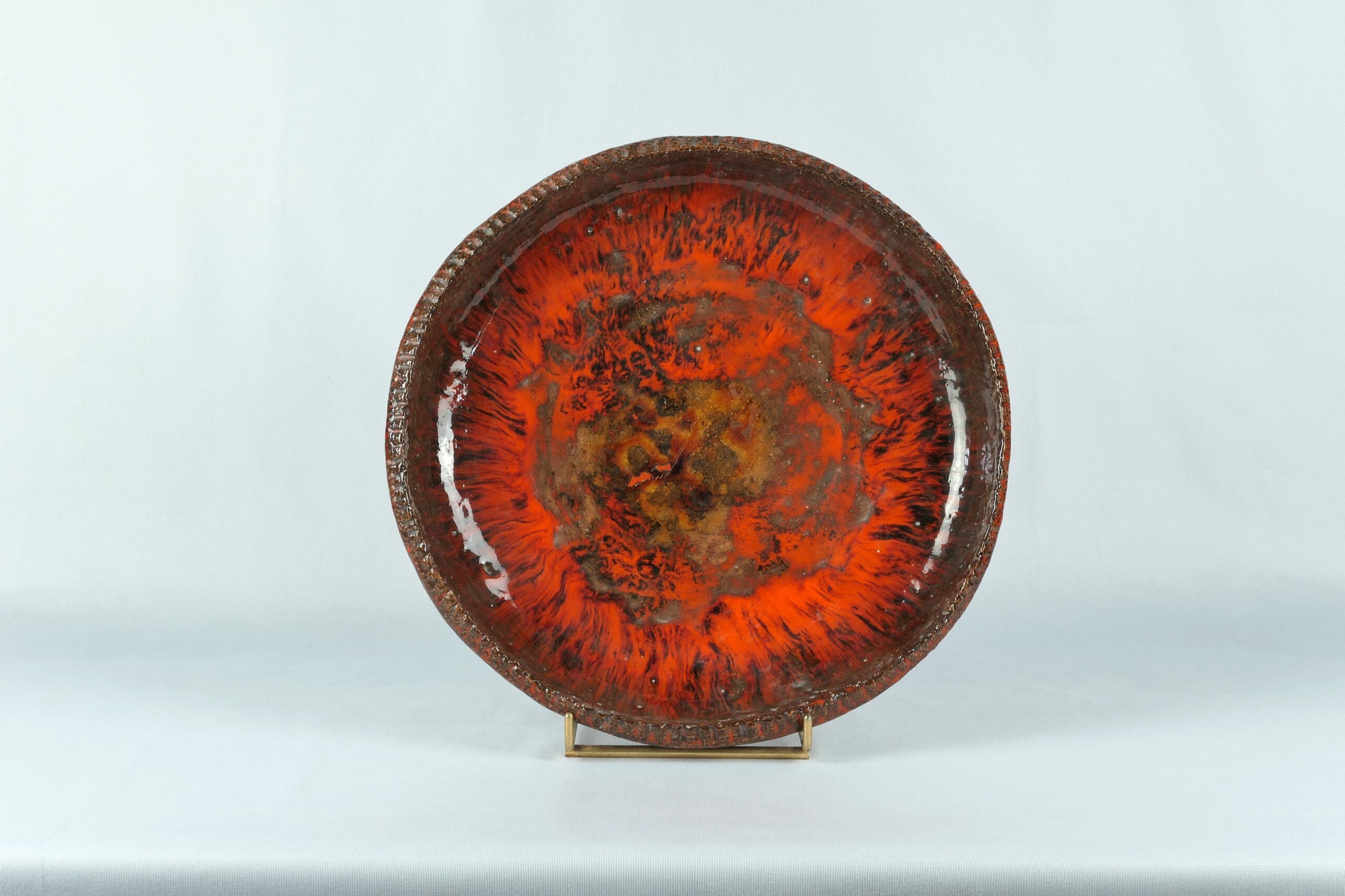 Formée aux Beaux-Arts de Tours, installée à Vallauris sur les conseils d’une amie, elle fréquente Chagall, Miró, Picasso, Hartung, Arman — et réalise une tapisserie avec Miró. Sa pratique est radicale : tout façonné à la main, décors obtenus par estampage avec des objets du quotidien, émaux surveillés heure par heure au four. Son orange caractéristique, dit « orange DEREL », et ses miroirs en terre sont devenus des objets de collection très recherchés. Après Vallauris, Saint-Paul-de-Vence et Saint-Pons, elle s’installe à Gréolières en 1988 et continue à se renouveler jusqu’à sa mort, formes toujours plus épurées, matière allégée, une œuvre qui n’a jamais cessé de se chercher.
